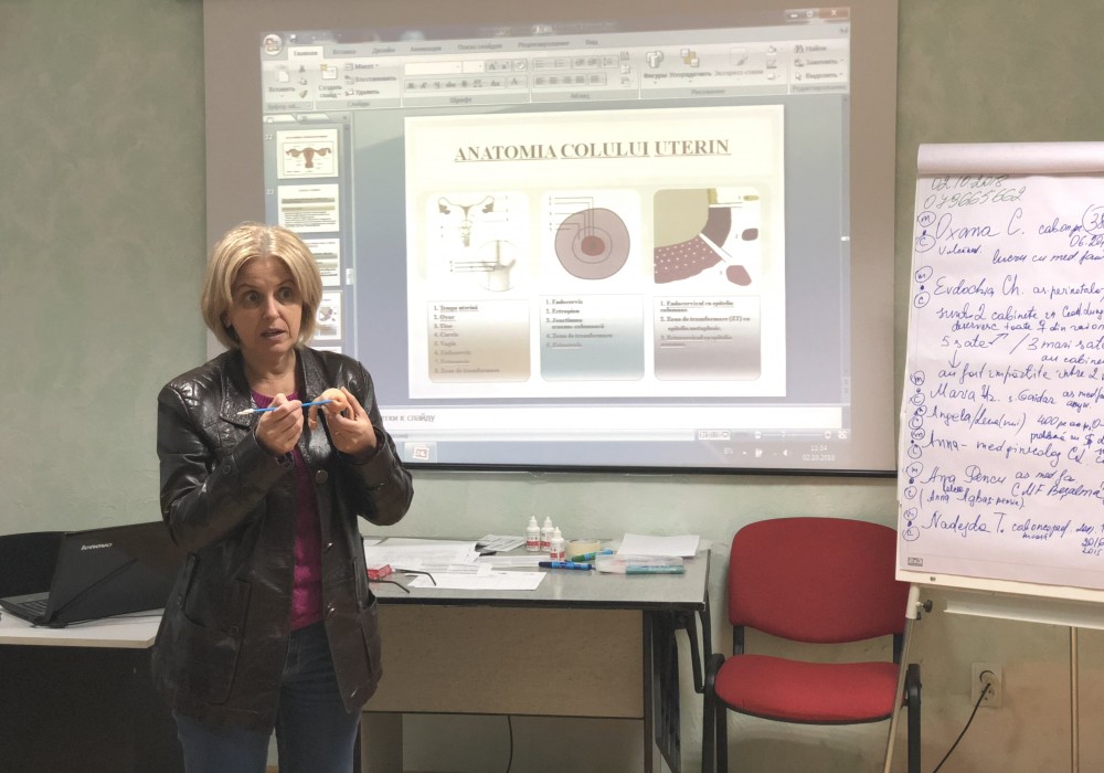 “Dacă o femeie ajunge să moară din cauza cancerului de col uterin, înseamnă că o bună parte din vină o poartă și lucrătorul medical, care nu a făcut tot posibilul pentru a o găsi și a o testa. Cancerul de col uterin este unica formă de cancer care poate fi ușor prevenită prin efectuarea testului de screening cervical”, spune Ludmila Bologan, medic obstetrician-ginecolog, unul din traineri în cadrul programului de instruire.